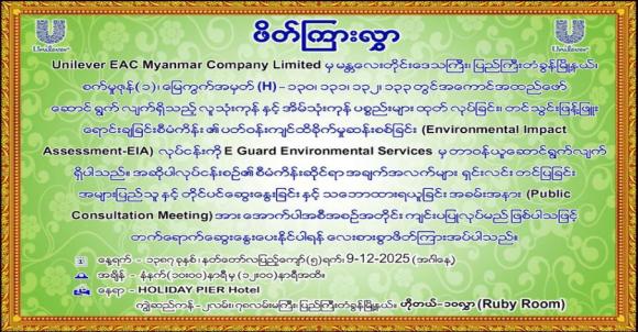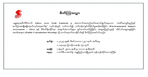 ရွှေဧရာနဒီလီမိတက် (Shwe Ayer Nadi Limited) မှ အကောင်အထည်ဖော်ဆောင်ရွက်နေသော “ခေါင်းလျှော်ရည်နှင့် ဆပ်ပြာအမျိုးမျိုးထုတ်လုပ်ရေးစက်ရုံ” လုပ်ငန်းနှင့် ပတ်သက်၍ ပတ်ဝန်းကျင် ထိခိုက်မှုဆန်းစစ်ခြင်း (Environmental Impact Assessment – EIA) နှင့် စီမံကိန်းဆိုင်ရာ အချက်အလက်များ ရှင်းလင်းတင်ပြခြင်း၊ အများပြည်သူနှင့် တိုင်ပင်ဆွေးနွေးခြင်း အခမ်းအနား (Public Consultation Meeting) သို့ တက်ရောက်ပေးနိုင်ပါရန် ဖိတ်ကြားအပ်ပါသည်။