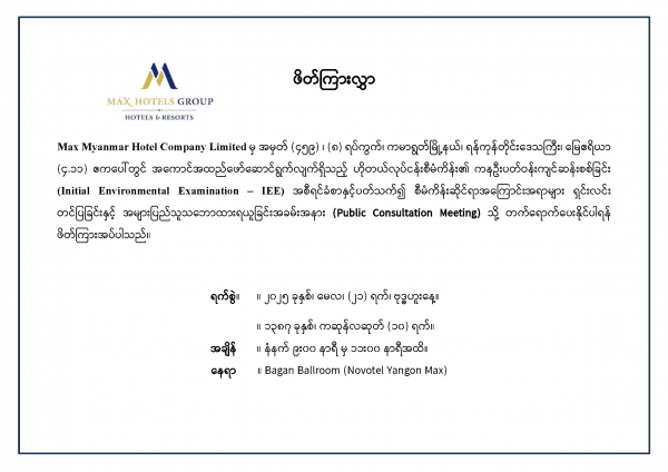 » ဖိတ်ကြားလွှာ - အများပြည်သူသဘောထားရယူခြင်းအခမ်းအနား Max Myanmar Hotel Company Limited