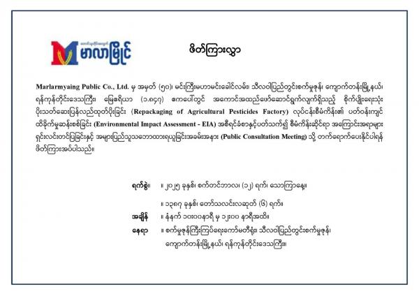 မာလာမြိုင်စိုက်ပျိုးရေးသုံး ပိုးသတ်ဆေးပြန်လည်ထုတ်ပိုးခြင်း လုပ်ငန်းစီမံကိန်း၏ ပတ်ဝန်းကျင် ထိခိုက်မှုဆန်းစစ်ခြင်း အစီရင်ခံစာ