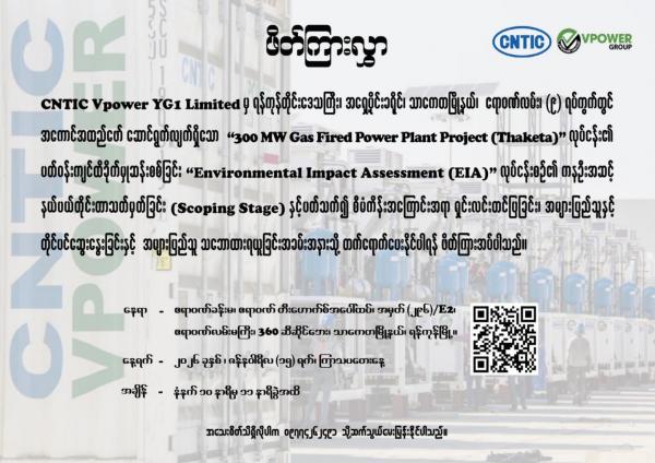CNTIC Vpower YG1 Limited မှ ရန်ကုန်တိုင်းဒေသကြီး၊ အရှေ့ပိုင်းခရိုင်၊ သာကေတမြို့နယ်၊ ဧရာဝဏ်လမ်း၊ (၉) ရပ်ကွက်တွင် “300 MW Gas Fired Power Plant Project (Thaketa)” လုပ်ငန်း၏ ပတ်ဝန်းကျင်ထိခိုက်မှုဆန်းစစ်ခြင်း “Environmental Impact Assessment (EIA)” လုပ်ငန်းစဉ်၏ ကနဦးအဆင့် နယ်ပယ်တိုင်းတာသတ်မှတ်ခြင်း (Scoping Stage) နှင့်ပတ်သက်၍ စီမံကိန်းအကြောင်းအရာ ရှင်းလင်းတင်ပြခြင်း၊ အများပြည်သူနှင့် တိုင်ပင်ဆွေးနွေးခြင်းနှင့် အများပြည်သူ သဘောထားရယူခြင်းအခမ်းအနားသို့ တက်ရောက်ပေးနိုင်ပါရန် ဖိတ်ကြားအပ်ပါသည်။